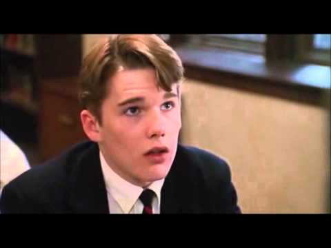Dans l'une des scènes de son cours, le Professeur Keating incite ses élèves à diversifier leur vocabulaire pour s'exprimer plus précisément. Et il y a cette scène célèbre où il leur "enseigne" sur un mode humoristique la véritable raison pour laquelle le langage a été inventé: